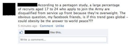 Secondo un studio del Pentagono, la maggior parte delle reclute di età compresa tra i 17 e i 24 anni vengono interdetti in anticipo perè sono sovrappeso. Se questo diventasse un trend globale, l’obesità potrebbe essere la risposta alla pace nel mondo.