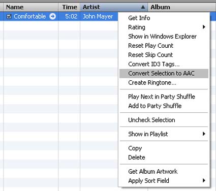 5.Una volta che siete tornati sulla schermata della libreria di iTunes, fate click nuovamente con il tasto destro sulla canzone e selezionate “Convert Selection to AAC”. In questo modo farete il re-encode della porzione di canzone selezionata.