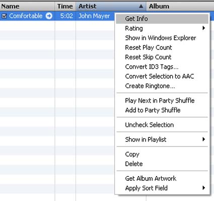 2.Fate click con il tasto destro del mouse sul nome della canzone e selezionate “Get Info”
