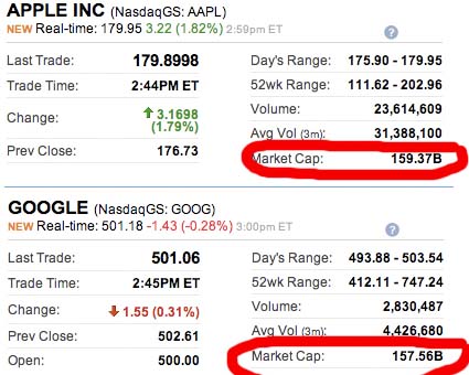 Il capitale di Apple infatti ammonta a 159,37 miliardi di dollari contro i 157,56 miliardi di Google. Valleywag già nel Novembre 2007 aveva previsto questo sorpasso: “Apple sa come progettare non solo i gadget ma anche i business che ci ruotano intorno,” il blog aveva osservato. “E, di conseguenza, non saremmo sorpresi se Apple sorpasserà Google entro due anni”. Apple aveva superato per la prima volta i 100 miliardi di dollari nel Maggio del 2007. La classifica attuale é la seguente: