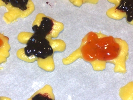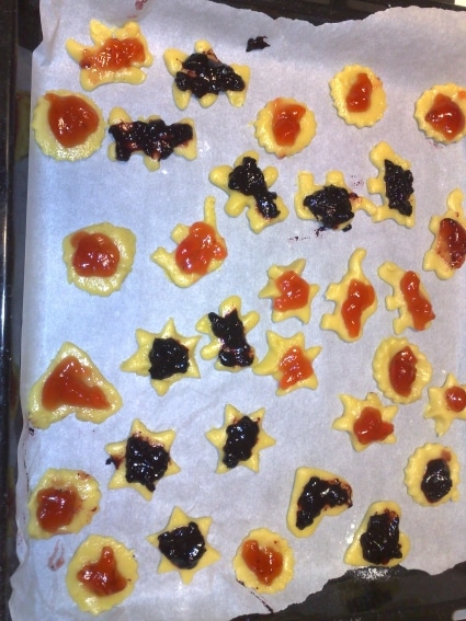 Ricoprire la teglia del forno con un foglio di carta forno e stendervi bene la pasta (non troppo sottile), quindi utilizzando le formine sbizzarritevi a creare i vostri biscotti.(se necessario aggiungervi sopra un po’ di farina).Stendervi sopra uno strato di marmellata (io ho utilizzato la marmellata di mirtilli e quella di fragole).