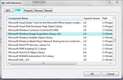 Tra le varie cose nuove fatte ultimamente, ho dovuto anche scrivere un metodo che acquisisce le immagini da scanner. Per l’interfacciamento con uno scanner non professionale i metodi sono 2, o si utilizzano i driver TWAIN installati con lo scanner oppure utilizzare il componente Microsoft Windows Image Acquisition Library v2.0 (brevemente WIA). Il metodo più semplice e veloce è l’utilizzo di questo componente che di default dovrebbe essere installato in tutte le macchine Windows XP (ma lo trovate anche in altri sistemi operativi – io il test l’ho fatto su una macchina con Windows 7 a 64 bit), ma se no lo potete scaricare e registrare da questo LINK.