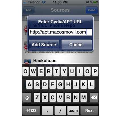 4.Toccate su “Edit” e quindi su “Add”. Ora dovrete inserire il seguente url: “http://apt.macosmovil.com“. Alla fine cliccate su “Add Source”.