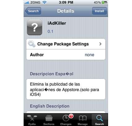 5.Cercate l’applicazione “iAdKiller” su Cydia e installatela. Questo software rimuoverà automaticamente tutti i banner basati su iAd dal vostro iPhone e iPod Touch con firmware iOS 4.0.