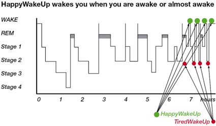 Come detto HappyWakeUp é una sveglia “intelligente” per telefoni cellulari. Il suo funzionamento permette di suonare durante la mattina proprio nel momento in cui siamo a letto e abbiamo ormai finito di dormire. Questa fase viene anche chiamata risveglio (o dormiveglia). Infatti la sensibilità di questa applicazione le permette di non cercare di svegliarci nel pieno del nostro sonno più profondo o nella nostra fase REM interrompendo, magari, il più bel sogno della nostra vita.