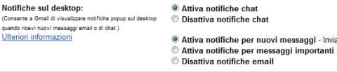 Per gli utenti di Google Chrome, Google ha lanciato un nuovo sistema di notifiche sul desktop, realizzato con il nuovo standard HTML5 che mostra dei pop-up ogni volta che un nuovo messaggio di chat o una nuova mail arrivi sul vostro account. Per attivare questo nuovo sistema dovete andare nelle impostazioni del vostro account Gmail e nella TAB Generali dovete trovare la voce Notifiche sul desktop. Qui dovete abilitare le voci: