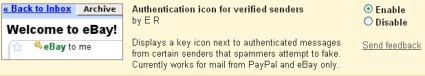 Tutte le mail che noi riceveremo da servizi come eBay o PayPal, grazie al widget di GMail, potranno essere verificate e se sono realmente mail provenienti da questi servizi potremmo notare una chiave vicino al nome, diversamente queste mail verranno spostate nella cartella di SPAM. Potete aggiungere questo widget dalle impostazioni di GMail, cliccando sulla voce GMail Labs e poi abilitando la voce “Authentication icon for verified senders”.