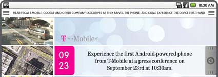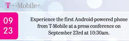 Oltre a questo, il primo cellulare, un HTC Dream per l’esattezza, con sistema operativo Android sarà presentato ufficialmente il 23 Settembre da parte di T-Mobile, come si può vedere nell’immagine.