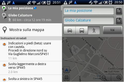 Il navigatore potrebbe essere molto utile anche nelle gite in qualche cittadina che non conoscete poiché riesce a guidarvi anche piedi. Ritornando all’esempio di prima, scegliendo le indicazioni stradali e poi l’opzione a piedi, ecco quello che mi propone: