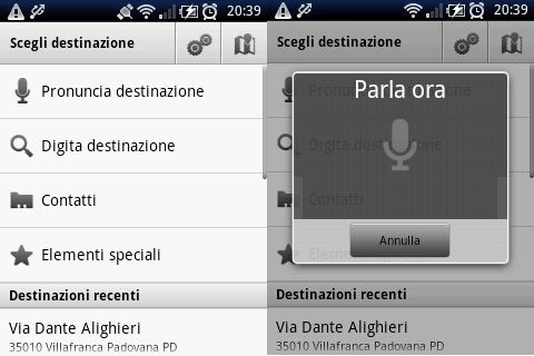 Se però, volete sfruttare al massimo questo navigatore, vi consiglio di fare un abbonamento dati con il vostro operatore. Andiamo a vedere tutte le caratteristiche di questo navigatore. Come potete vedere dall’immagine sopra, nell’home del navigatore avete la possibilità di cercare la vostra destinazione, che può essere una città, una via oppure direttamente un’attività commerciale di una città, oppure pronunciate una destinazione (parlate piano e cercate di scandire bene le parole), oppure, se avete impostato l’indirizzo dei vostri contatti e volete andare da uno di questi potete selezionare il vostro contatto per ricavare le indicazioni verso di questo.