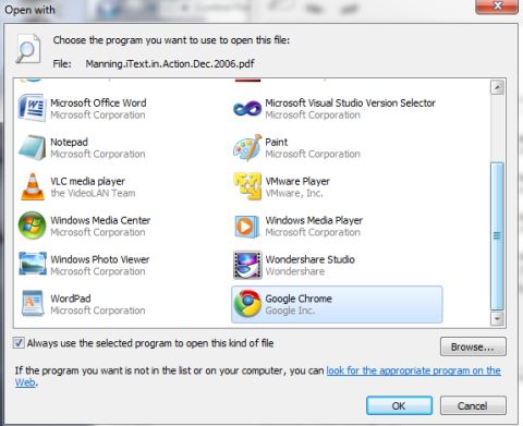 Lasciate la finestra aperta, per ricavare il percorso completo al eseguibile. A questo punto individuate un file PDF sul vostro computer e cliccate con il pulsante destro del mouse e selezionare la voce “Apri con…” dal context menu di windows explorer. Nella maschera successiva dovete cliccare sul pulsante Sfoglia in basso a destra. A questo punto copiate il percorso di Chrome individuato prima e incollatelo nella barra di ricerca sotto e poi premete invio. A questo punto dovreste trovarvi nella cartella di Google Chrome. Selezionate il file “chrome.exe” e poi cliccate su Apri.