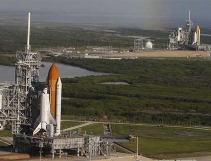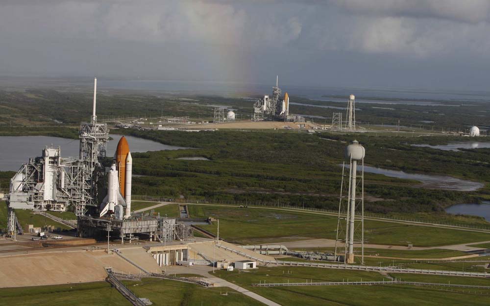 Lo Shuttle in primo piano é l’Atlantis sulla postazione di lancio A, mentre quello sullo sfondo é l’Endeavour sulla postazione B. Attualmente entrambe le navette sono pronte per la partenza, se qualcosa dovesse andare storto nella missione Atlantis dell’10 Ottobre. Come detto, vedere due shuttle insieme e pronti per il decollo non é cosa frequentissima, ma non per questo dobbiamo pensare al peggio.