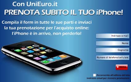 Ebbene si, tutti noi possiamo prenotare l’iPhone 3G direttamente sul sito di Uniero e, è bene sottolinearlo, senza obbligo d’acquisto. Il link è il seguente. Al momento dell’uscita del prodotto Apple in Italia, l’11 Luglio, tutti i fortunati utenti con la prenotazione in tasca saranno contattati e potranno decidere di completare l’acquisto online o di abbandonare. Non sarà possibile recarsi in un punto vendita e far valere la prenotazione di persona. Sul sito Vodafone invece è presente un form per richiedere maggiori delucidazioni riguardo le future offerte e abbonamenti che includeranno l’iPhone 3G. Ecco a voi il link vodafone.