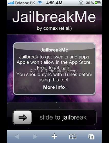 3.Una volta finito l’aggiornamento aprite Safari e andate all’indirizzo “http://jailbreakme.com“. La connessione Wi-Fi è preferibile a quella 3G perchè più performante. Io personalmente ho usato quella 3G e tutto è andato bene al primo colpo. Inoltre, se l’indirizzo scritto in precedenza non dovesse funzionare provate le seguenti alternative che non faranno altro che riportarvi alla homepage di JailbreakMe: