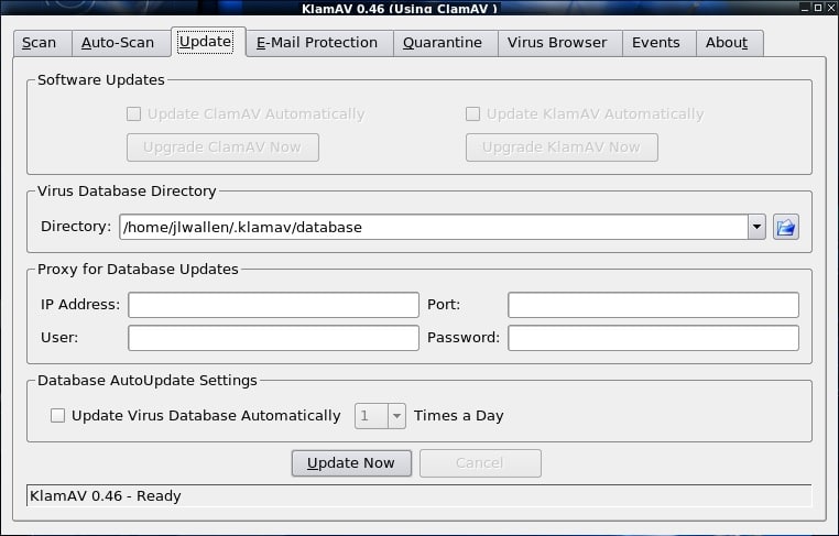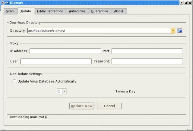 Una volta completata l’installazione avviate KlamAV. La prima volta che si avvia tramite un semplicissimo Wizard dovete impostare la cartella di quarantena, il database di definizione di virus e cosi via. Alla fine della procedura guidata sarete avvisati che il database di definizione di virus non è aggiornato, quindi non dovete fare nient’altro che cliccare sul pulsante Update Now per far iniziare l’aggiornamento (vedi immagine sotto).
