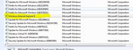 Poi nel menu di sinistra dovete cliccare sulla voce View Installed Updates (Visualizza aggiornamenti installati). Nella lista di destra dovete trovare Internet Explorer 9 su cui dovete cliccare con il pulsante destro del mouse e cliccare su disinstalla o uninstall.