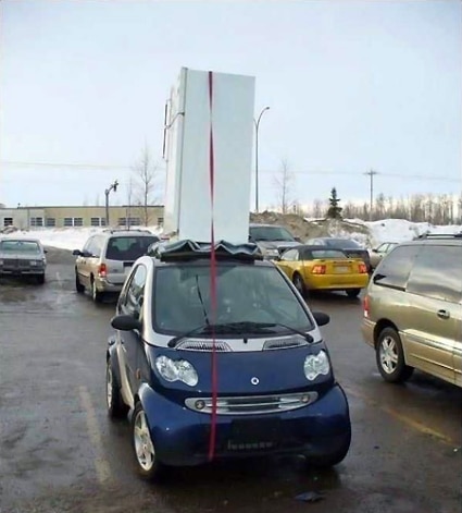 Non fate come il tizio della foto che è entrato per acquistare un box frigo da campeggio…ma vista la super offerta per la ghiacciaia ha preferito comperare quest’ultima….dimenticandosi di avere una Smartina parcheggiata fuori……e non credo proprio che la soluzione escogitata vi eviti la multa per carico non corretto.