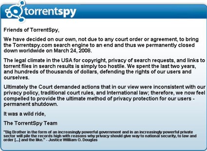 Nel 2006 TorrentSpy era il sito più popolare di qualsiasi altro sito in giro per il mondo sulla ricerca dei file BitTorrent, ma questo è cambiato dal mese di agosto 2007, quando un giudice federale ha ordinato a TorrentSpy di accedere a tutti gli dati degli utenti. Per garantire la privacy dei propri utenti, TorrentSpy prese una decisione abbastanza eroica, decise di bloccare l’accesso a tutti gli utenti che si collegavano dagli Stati Uniti. Naturalmente questa cosa ha portato un calo drastico degli utenti quindi di conseguenza anche dei ricavi.