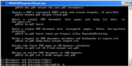 Aprite il prompt dei comandi andando su Start -> Esegui e poi digitate CMD. Nel prompt dei comandi digitate pdftk -h per visualizzare l’help del programma. Adesso vi dirò dei esempi di comandi che potete eseguire con questo toolkit.