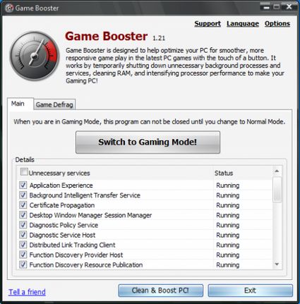 GameBooster è in grado di deframmentare la directory del videogioco, di disattivare i servizi e processi in background inutili e che rallenterebbero l’esecuzione, iliberando RAM e risorse della CPU, rendendo il PC molto più performante, e aumentando allo stesso tempo stabilità e compatibilità del gioco stesso.